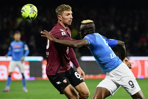 Napoli's Nigerian forward Victor Osimhen (R) challenges Salernitana's Italian defender Matteo Lovato during the Italian Serie A football match between Salernitana and Napoli on January 21, 2023 at the Arigis stadium in Salerno. (Photo by Filippo MONTEFORTE / AFP) (Photo by FILIPPO MONTEFORTE/AFP via Getty Images)