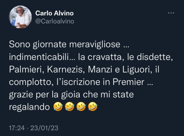 “Sono giornate meravigliose … indimenticabili… la cravatta, le disdette, Palmieri, Karnezis, Manzi e Liguori, il complotto, l’iscrizione in Premier … grazie per la gioia che mi state regalando”.