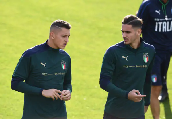 FLORENCE, ITALY - OCTOBER 07: Pierluigi Gollini and Alex Meret of Italy chat during an Italy training session at Centro Tecnico Federale di Coverciano on June 7, 2019 in Florence, Italy. (Photo by Claudio Villa/Getty Images)