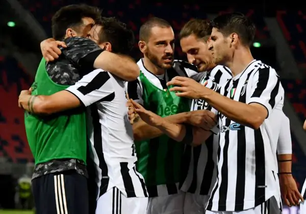 (From L) Juventus' Italian goalkeeper Gianluigi Buffon, Juventus' Argentine forward Paulo Dybala, Juventus' Italian defender Leonardo Bonucci, Juventus' French midfielder Adrien Rabiot and Juventus' Spanish forward Alvaro Morata celebrate after Morata scored the second goal during the Italian Serie A football match Bologna vs Juventus Turin on May 23, 2021 at the Renato-Dall'Ara stadium in Bologna. (Photo by Andreas SOLARO / AFP) (Photo by ANDREAS SOLARO/AFP via Getty Images)