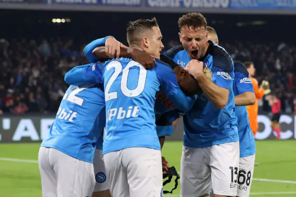 NAPLES, ITALY - JANUARY 13: Victor Osimhen of SSC Napoli celebrates with teammates after scoring the 1-0 goal during the Serie A match between SSC Napoli_Juventus at Stadio Diego Armando Maradona on January 13, 2023 in Naples, Italy. (Photo by Francesco Pecoraro/Getty Images)