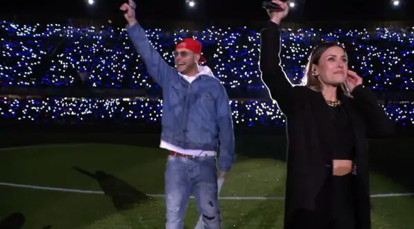 Non manca molto all’inizio di Napoli-Roma e oltre al riscaldamento delle due squadre, nel prepartita c’è stato uno straordinario gioco di luci al Maradona. Coca Cola, infatti, ha organizzato un evento con protagonisti Clementino e Fatima Trotta (ex presentatrice di Made in Sud). Inoltre, sono stati distribuiti a tutto lo stadio dei braccialetti luminosi che hanno creato un’atmosfera particolare. Al centro del campo, poi, c’erano proprio Clementino e Fatima Trotta che hanno cantato.