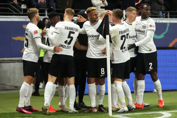 FRANKFURT AM MAIN, GERMANY - JANUARY 21: Rafael Borre of Eintracht Frankfurt celebrates their team's second goal with teammates during the Bundesliga match between Eintracht Frankfurt and FC Schalke 04 at Deutsche Bank Park on January 21, 2023 in Frankfurt am Main, Germany. (Photo by Alex Grimm/Getty Images)