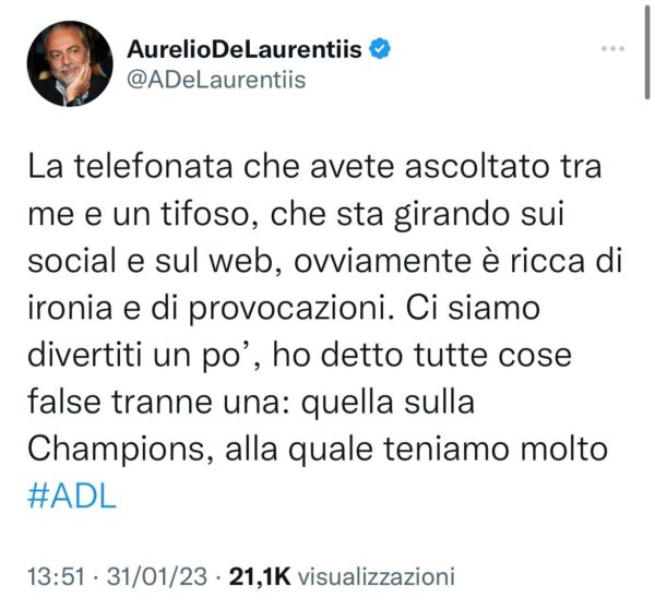 Nelle ultime ore ha girato sui social la telefonata tra un tifoso ed Aurelio De Laurentiis, in cui il presidente del Napoli ironizza sulla città, sui tifosi e sulle aspirazioni del club per questa stagione. Il patron azzurro ha tenuto a specificare tramite il proprio profilo ufficiale di Twitter, che le sue parole sono con tono ironico e volutamente ricche di provocazioni.
