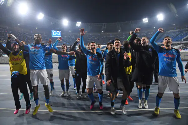 NAPLES, ITALY - JANUARY 29: SSC Napoli players celebrate the victory after the Serie A match between SSC Napoli and AS Roma at Stadio Diego Armando Maradona on January 29, 2023 in Naples, Italy. (Photo by Francesco Pecoraro/Getty Images)