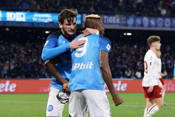 NAPLES, ITALY – JANUARY 29: Victor Osimhen of SSC Napoli celebrates after scoring the 1-0 goal during the Serie A match between SSC Napoli and AS Roma at Stadio Diego Armando Maradona on January 29, 2023 in Naples, Italy. (Photo by Francesco Pecoraro/Getty Images)