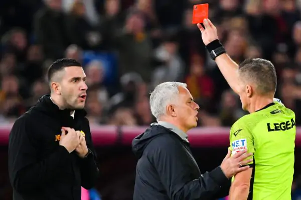 AS Roma's Portuguese coach Jose Mourinho (C) reacts as Italian referee Daniele Orsato gives a red card to AS Rome's assitant coach Salvatore Foti (L) during the Italian Serie A football match between AS Rome and Lazio on November 6, 2022 at the Olympic stadium in Rome. (Photo by Tiziana FABI / AFP) (Photo by TIZIANA FABI/AFP via Getty Images)