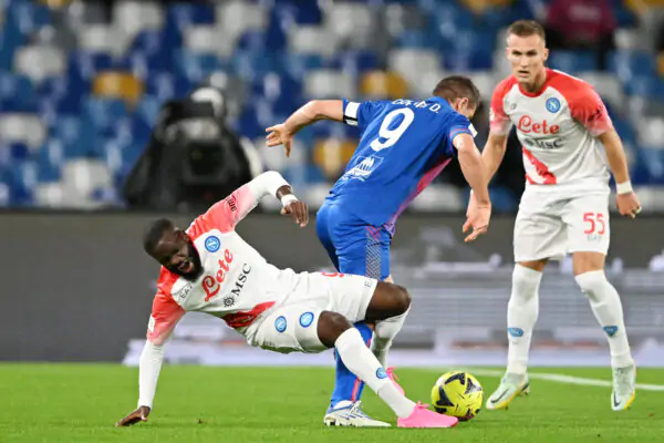 NAPLES, ITALY - JANUARY 17: Tanguy Ndombele of SSC Napoli battles for possession with Daniel Ciofani of US Cremonese during the Coppa Italia match between SSC Napoli and US Cremonese at Stadio Diego Armando Maradona on January 17, 2023 in Naples, Italy. (Photo by Francesco Pecoraro/Getty Images)
