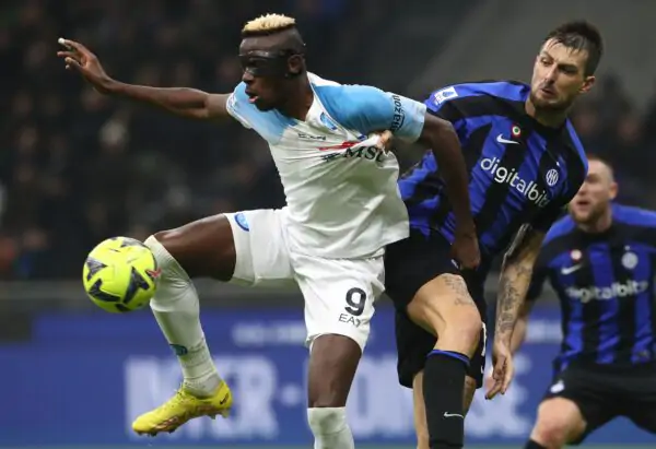 MILAN, ITALY - JANUARY 04: Francesco Acerbi (R) of FC Internazionale competes with Victor Osimhen (L) of SSC Napoli during the Serie A match between FC Internazionale and SSC Napoli at Stadio Giuseppe Meazza on January 04, 2023 in Milan, Italy. (Photo by Marco Luzzani/Getty Images)