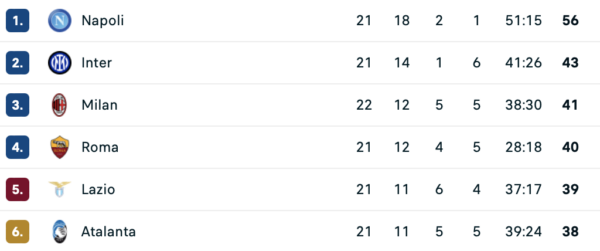 È evidente dunque come, mentre il Napoli stia facendo un campionato a parte, per le altre squadre ci sia una lotta serrata per assicurarsi i tre posti rimanenti per la qualificazione alla prossima edizione della Champions League.