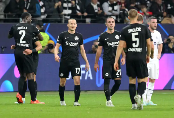 Frankfurt's German midfielder Sebastian Rode (3L), Frankfurt's French defender Evan N'Dicka (L), Frankfurt's German midfielder Mario Goetze (4R) and other players react at the end of the UEFA Champions League Group D football match between Eintracht Frankfurt and Olympique de Marseille in Frankfurt, western Germany on October 26, 2022. - Frankfurt won the match 2-1. (Photo by Daniel ROLAND / AFP) (Photo by DANIEL ROLAND/AFP via Getty Images)