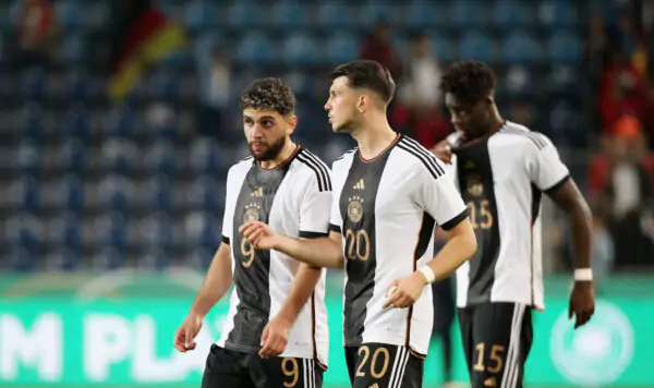 MAGDEBURG, GERMANY - SEPTEMBER 23: Reda Khadra, Lazar Samardzic and Yann Aurel Bisseck of Germany after the International Friendly between Germany U21 and France U21 at MDCC Arena on September 23, 2022 in Magdeburg, Germany. (Photo by Karina Hessland-Wissel/ Getty Images)