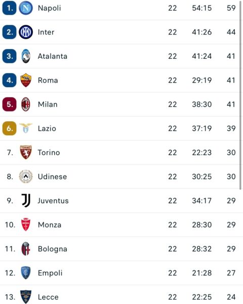 Di seguito, la nuova classifica dopo la ventiduesima giornata: