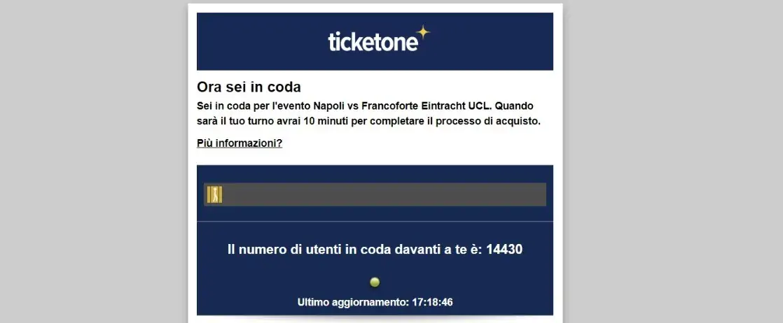 Dalle 14:00 di oggi la situazione su TicketOne è critica: file interminabili con oltre 10mila persone in attesa che cercano di avere accesso alla vendita. In questa prima fase, fino a venerdì quando verranno poi sbloccati anche i posti degli abbonati che non hanno acquistato il biglietto, risultano già sold out la Curva B e la Curva A superiori.