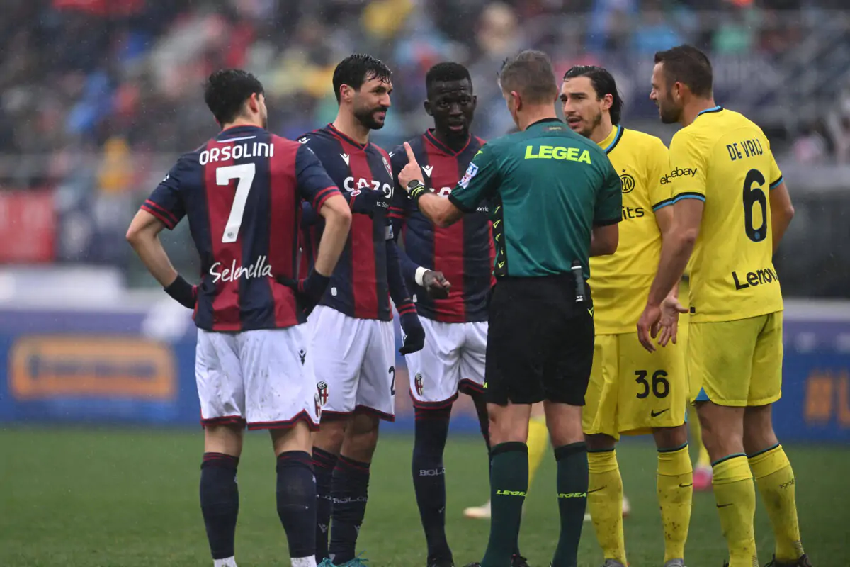 Daniele Orsato RefereeRiccardo Orsolini BolognaRoberto Soriano BolognaMusa Barrow BolognaMatteo Darmian InterStefan De Vrij Inter during the Italian Serie A match between Bologna 1-0 Inter at Renato Dall Ara Stadium on February 26, 2023 in Bologna, Italy. Noxthirdxpartyxsales PUBLICATIONxNOTxINxJPN 211849323