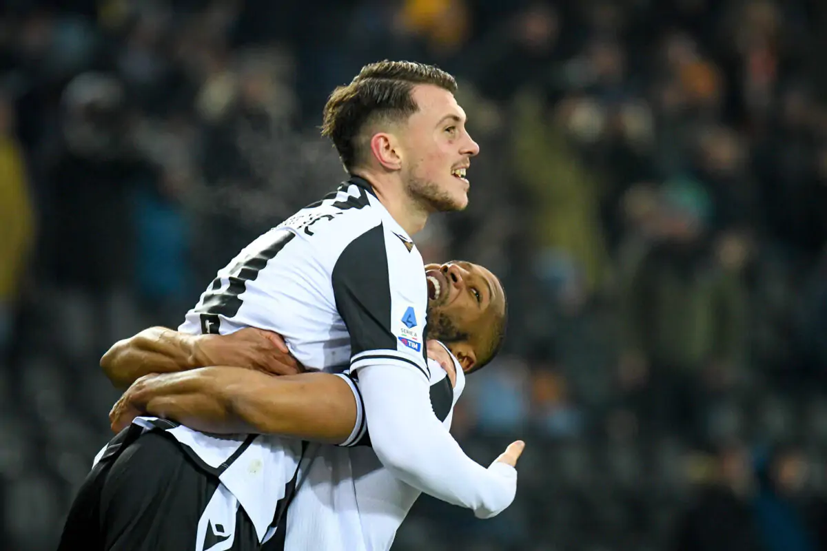 Udinese Calcio v Hellas Verona - Serie A Udinese s Lazar Samardzic celebrates after scoring a goal with Udinese s Beto Betuncal during the italian soccer Serie A match Udinese Calcio vs Hellas Verona on January 30, 2023 at the Friuli - Dacia Arena stadium in Udine, Italy Udine Italy PUBLICATIONxNOTxINxFRA Copyright: xEttorexGriffonix originalFilename:livemedia-udinesec230130_npPy6.jpg