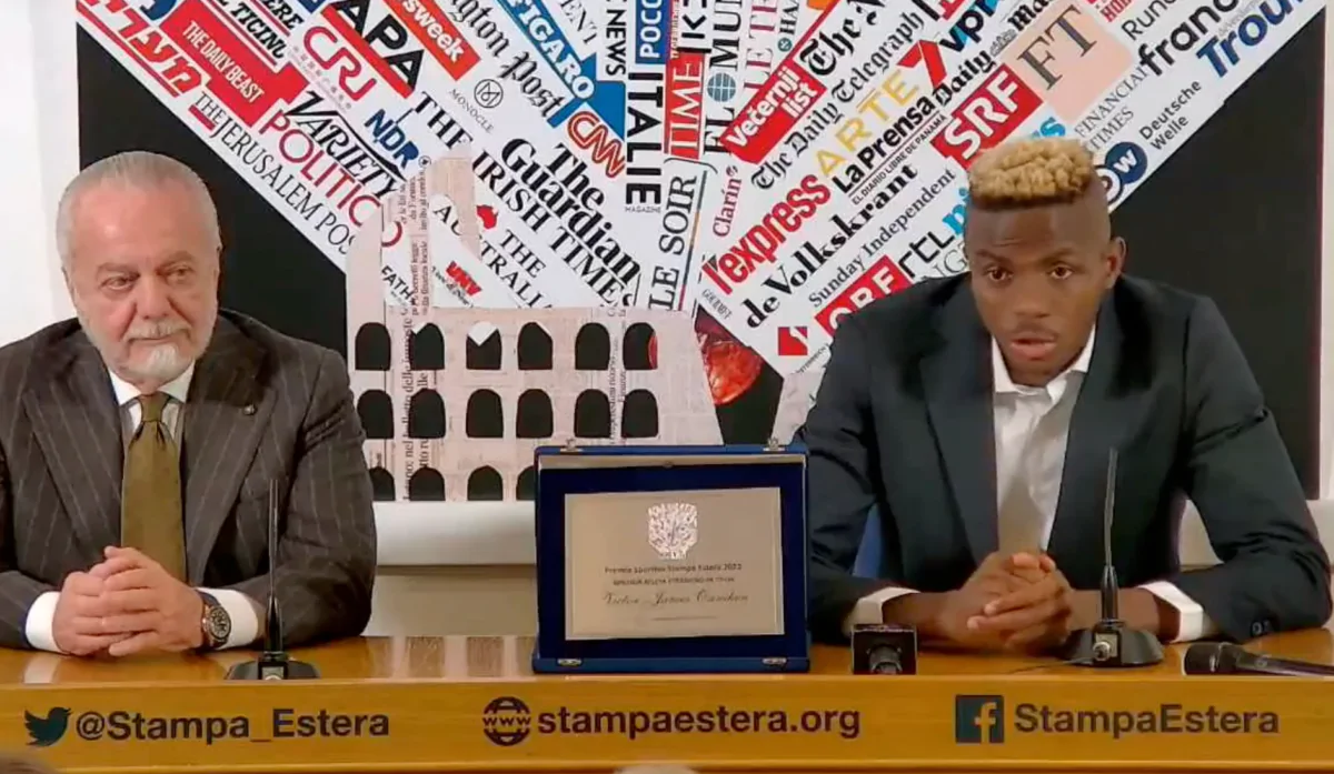 Nella giornata odierna Victor Osimhen, in compagnia del presidente del Napoli Aurelio De Laurentiis, ha ricevuto uno speciale premio dalla Stampa estera in Italia. L’attaccante azzurro è stato infatti premiato come miglior atleta straniero ed il suo arrivo in sala è stato accolto da un fantastico messaggio che recitava le seguenti parole: