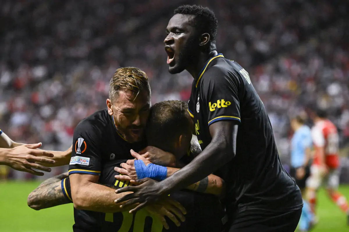 Union s Gustaf Nilsson, Union s Guillaume Francois and Union s Victor Boniface celebrate after scoring during a match between the Portugese club SC Braga and Belgian soccer team Royale Union Saint-Gilloise, Thursday 06 October 2022 in Braga, Portugal, the third game out of six in the group stage of the UEFA Europa League competition. LAURIExDIEFFEMBACQ PUBLICATIONxNOTxINxBELxFRAxNED x46404357x