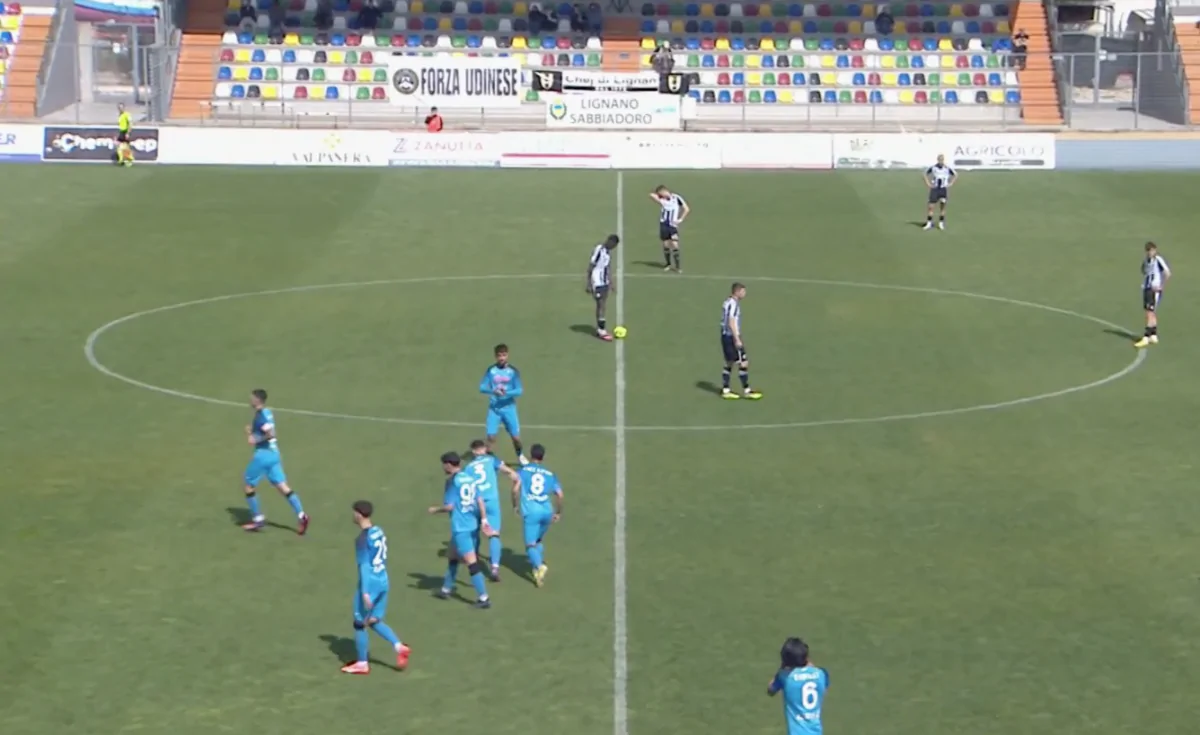 Nella ripresa altro piglio da parte dell’Udinese che cerca in tutti i modi di trovare il pareggio, con gli azzurrini che invece controllano e cercano la ripartenza giusta per colpire ancora i friulani. Ad andare vicino al gol è però Centis che con il destro a giro centra in pieno la traversa a Boffelli battuto. Nonostante i cambi, è ancora l’Udinese a rendersi pericolosa, ma è sempre attento Valerio Boffelli a sventare la minaccia, in particolare su un errato retropassaggio di Barba su cui l’estremo difensore azzurro deve superarsi.