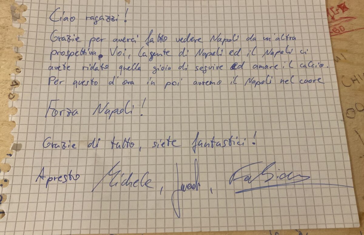 Questa la lettera lasciata da Michele, Fabian e Jacob, che lunedì mattina hanno fatto ritorno a Vienna. Ma il weekend vissuto a Napoli – ne siamo sicuri – resterà per sempre scolpito nella loro mente e nei loro cuori.
