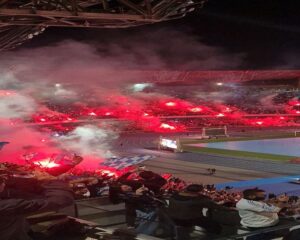 I sostenitori hanno celebrato il pari accendendo fumogeni. L’arena di Fuorigrotta ha ormai vita propria, perchè il Napoli sta per raggiungere la meta desiderata per 33 lunghi anni.
