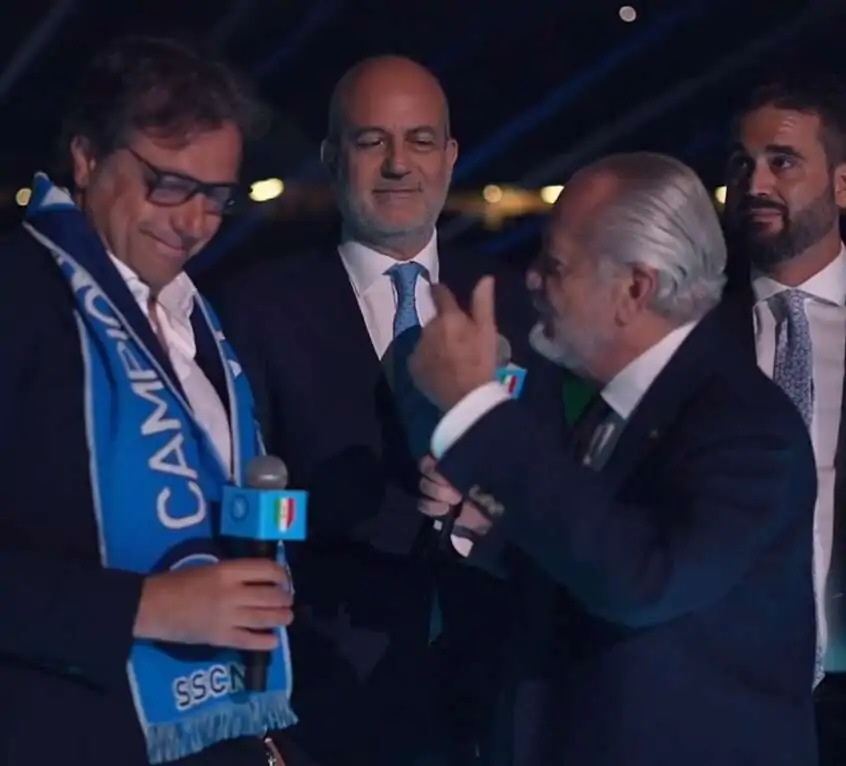 Durante la festa Scudetto, al centro del Maradona è scesa tutta la dirigenza del Napoli, compreso Cristiano Giuntoli, diretto sportivo dei partenopei: Giuntoli ha voluto ringraziare famiglia e dirigenza.
