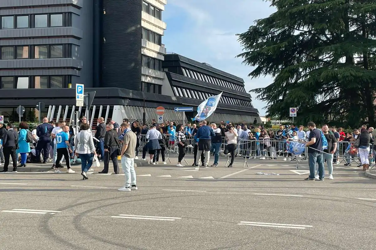 Il Napoli ha già vinto lo scudetto, ma i suoi tifosi non hanno nessuna intenzione di smettere di festeggiare. Non solo quelli residenti in città, ma anche coloro che il Napoli possono viverlo solo da lontano o in trasferta. E anche oggi i supporters azzurri hanno scelto di stare al fianco della squadra.