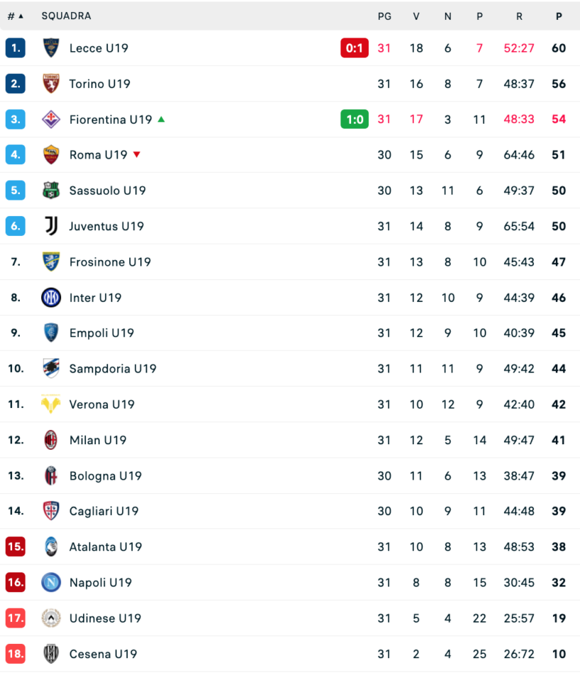 ECCO LA CLASSIFICA DEL CAMPIONATO PRIMAVERA: