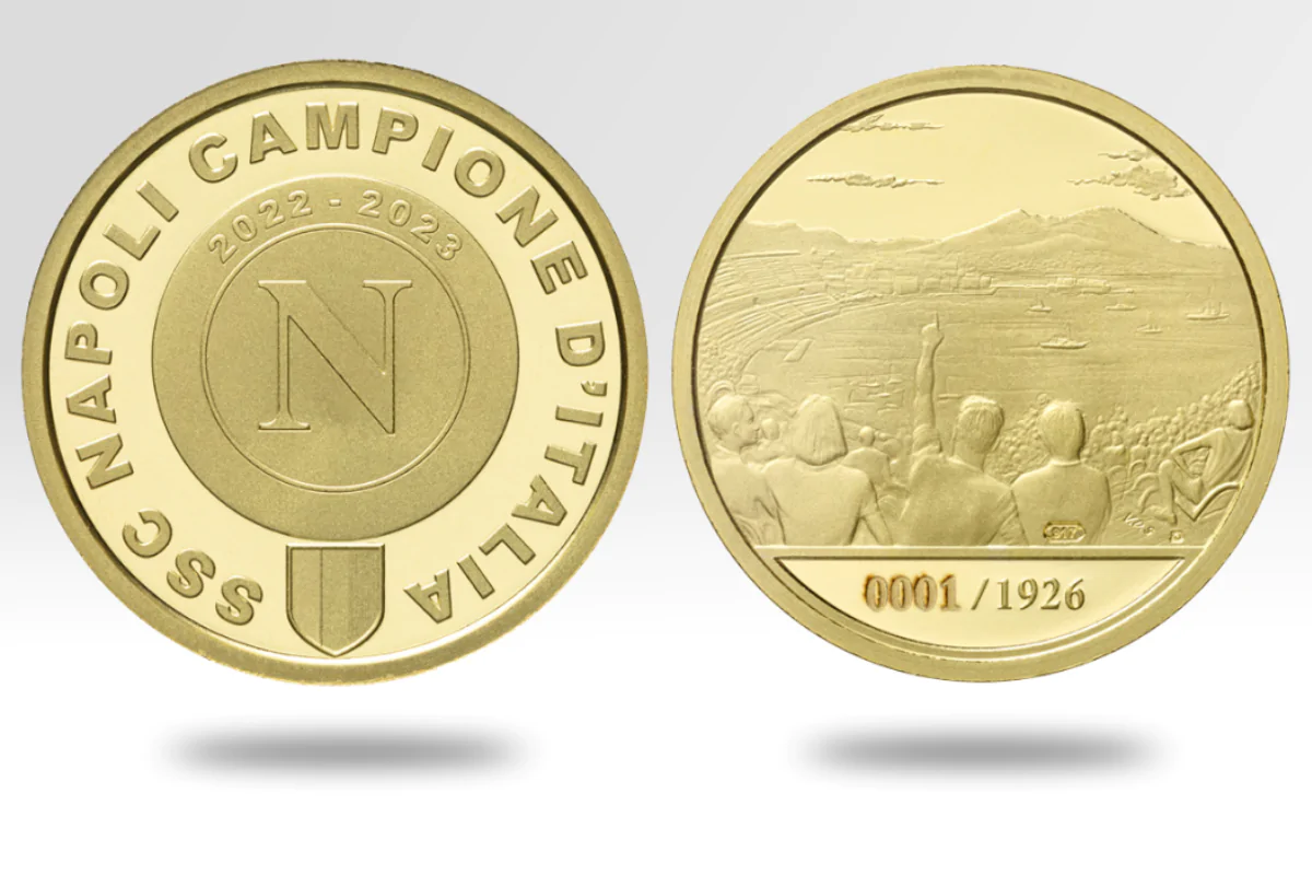 La medaglia d’oro avrà il costo non casuale di 1926 euro e rappresenterà nella facciata principale lo scudetto del club con la dicitura “SSC Napoli campione d’Italia”, mentre nella parte posteriore sarà rappresentato il Golfo di Napoli con in primo piano dei tifosi sugli spalti del Maradona ed il numero di serie della moneta.