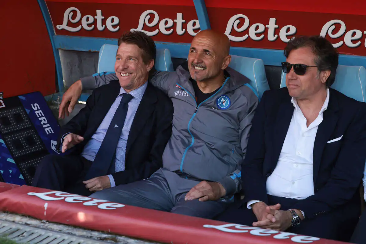 Naples, Italy, 7th May 2023. Giuseppe Santoro SSC Napoli Team Manager, Luciano Spalletti Head coach of SSC Napoli and Cristiano Giuntoli SSC Napoli Director of react in the dugout prior to kick off in the Serie A match at Stadio Diego Armando Maradona, Naples. Picture credit should read: Jonathan Moscrop / Sportimage EDITORIAL USE ONLY. No use with unauthorised audio, video, data, fixture lists, club/league logos or live services. Online in-match use limited to 120 images, no video emulation. No use in betting, games or single club/league/player publications. SPI-2423-0188