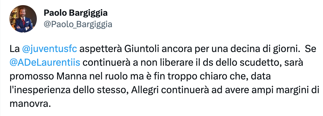 Si tratta di Giovanni Manna, attuale direttore sportivo della Next Gen., la secondo squadra della Juventus che milita in Serie C. Chiaramente la sua esperienza non sarebbe di altissimo livello: in caso di promozione di Manna, sarebbe Allegri ad avere più potere decisionale anche sul mercato.