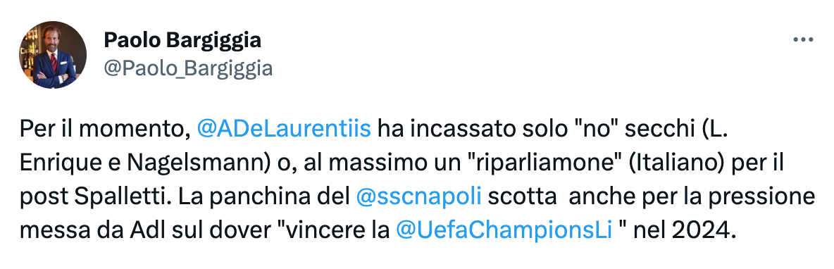 I motivi di tali titubanze – conclude Bargiggia – sarebbe da ricondurre alle pressioni che il presidente del Napoli starebbe mettendo al prossimo tecnico chiedendo di vincere la Champions League.