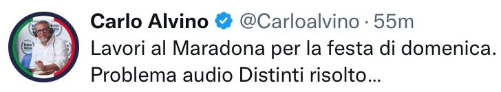 “Lavori al Maradona per la festa di domenica. Problema audio Distinti risolto”, ha scritto il giornalista sul suo profilo ufficiale Twitter.