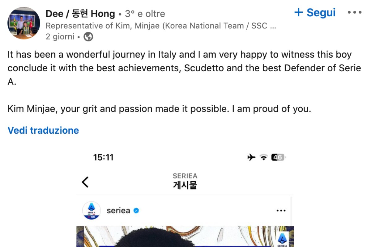 Kim Minjae, la tua grinta e la tua passione lo hanno reso possibile. Sono orgoglioso di te.