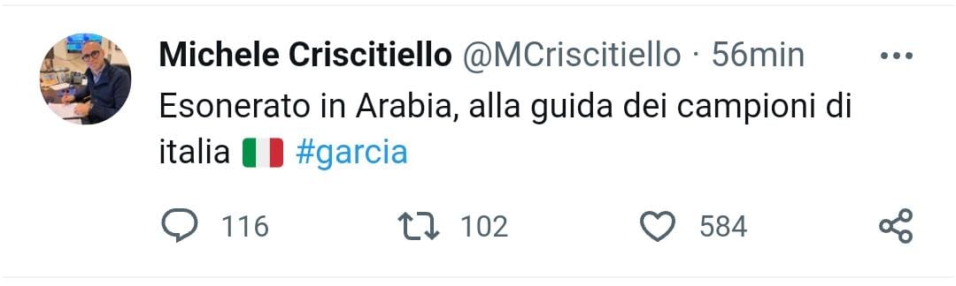 “Esonerato in Arabia, alla guida dei campioni d’Italia”, ha detto il giornalista sul proprio account. Un tweet che sa tanto di polemica in merito all’annuncio pubblicato dal Napoli proprio nell’ultima ora.