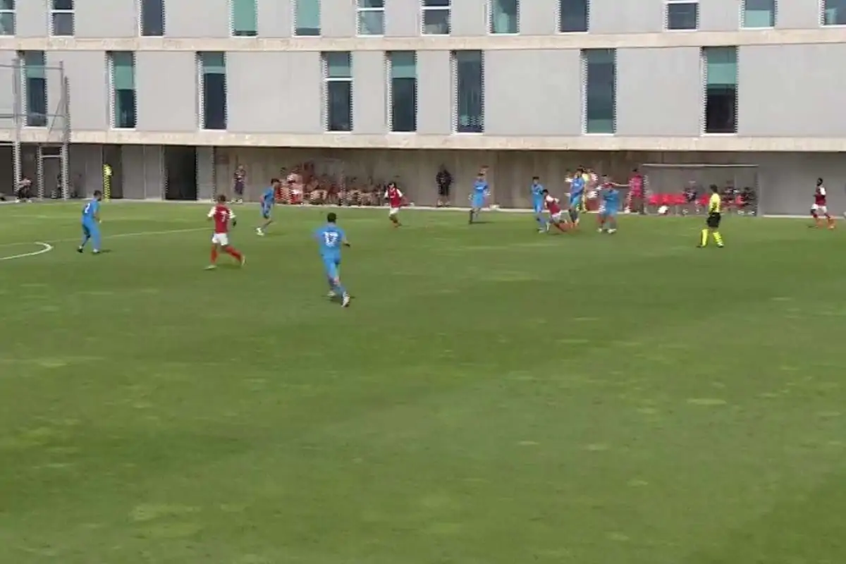 Arriva però la risposta del Napoli, che nel giro di pochi minuti per due volte impensierisce la retroguardia portoghese, prima Vigliotti e poi De Chiara vanno vicini al pareggio. Al 33esimo e 36esimo, è l’esterno del Braga, Roger Fernandes, a richiamare all’attenti l’estremo difensore napoletano Turi che salva con un ottima parata nella prima occasione e vede sfilare fuori il pallone nella seconda. Il primo tempo termina con i padroni di casa in attacco, senza però che riescano a trovare la via del gol, si resta quindi sull’1-0.