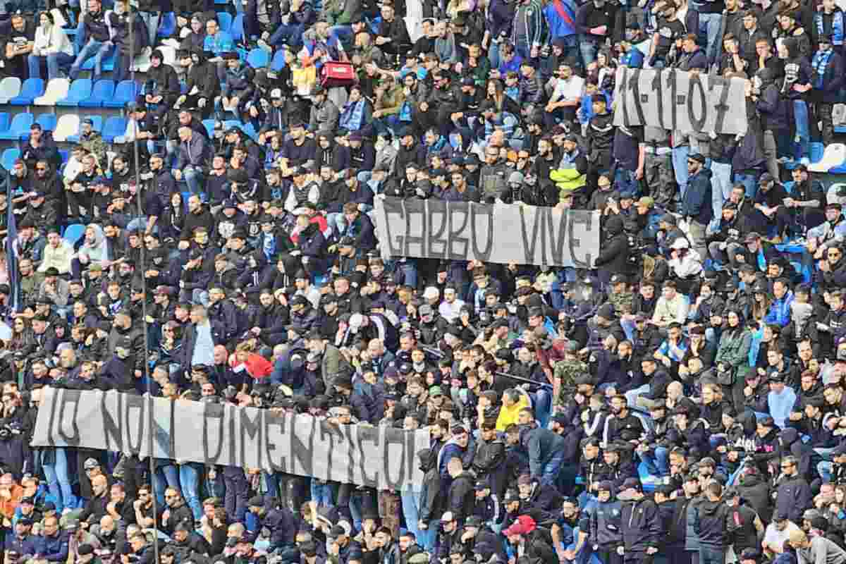 La Curva A ha abbassato tutte le bandiere e ha esposto lo striscione in ricordo di Gabriele.