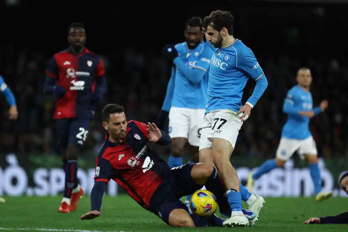 Nonostante la pressione costante dei padroni di casa, i sardi sono però riusciti a chiudere illesi il primo tempo, sfiorando addirittura il vantaggio nel finale, sfruttando l’unico contropiede concesso dal Napoli, occasione in cui Alex Meret è risultato decisivo sbarrando la strada a Natan.