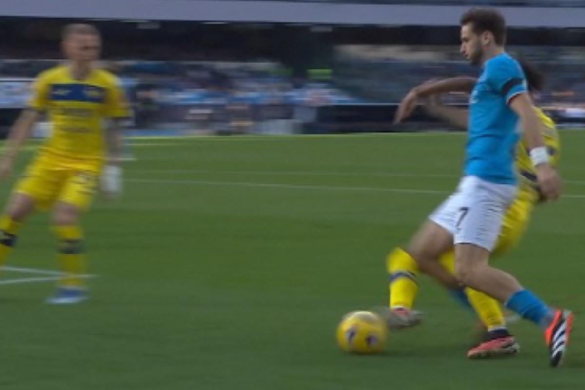 Il Napoli di mister Walter Mazzarri recrimina un calcio di rigore, che dai frame sembra essere abbastanza evidente. Il club azzurro è andato su tutte le furie dopo la decisione dubbia assunta da Marco Piccinini e dal Var in seguito al contatto tra Cabal e Kvaratskhelia. Dopo essersi incuneato in area di rigore, l’attaccante georgiano del Napoli viene travolto dal difensore scaligero, finendo a terra. Contatto che l’arbitro Marco Piccinini ha preferito lasciar correre, giudicando l’episodio non punibile con l’assegnazione di un penalty in favore del Napoli. Il direttore di gara si è mostrato molto sicuro nella decisione presa, mettendo da parte anche l’ausilio del Var.