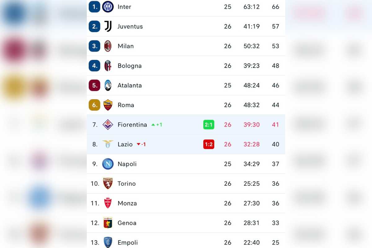 Serie A, la classifica dopo Roma-Torino e Fiorentina-Lazio