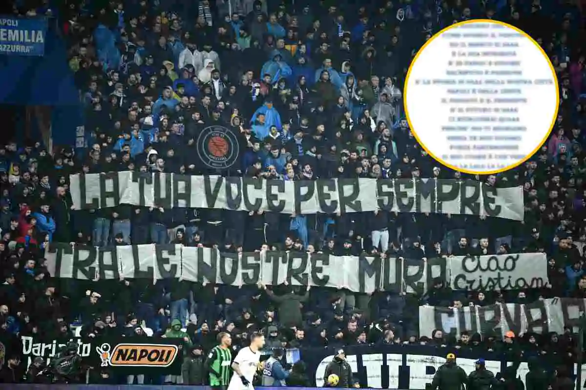 Il coro scritto da Cristian Vollaro diventerà un must della curva partenopea a partire da domenica. “DA DOMENICA E PER SEMPRE LO CANTEREMO IN GRADINATA. CANTALA INSIEME A NOI IN QUALSIASI SETTORE TU SIA“, scrivono le due curve nel comunicato.