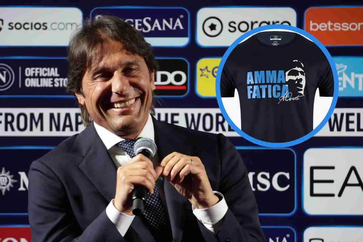 In occasione della presentazione di Antonio Conte, il Napoli ha lanciato una nuova t-shirt dedicata al suo nuovo condottiero, in particolare si fa riferimento alla frase motto pronunciata qualche settimana fa del tecnico leccese, “Amma Faticà“, diventata subito virale. Il costo sarà di 25 euro ed è possibile acquistarla in pre-ordine già nella giornata odierna, per poterla ricevere dal prossimo 1 luglio.