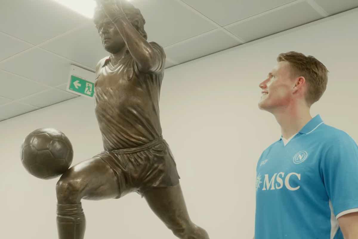 “Questa maglia è incredibile, mi piace tantissimo!”, dice Scott. Poi ancora, un passaggio anche su Maradona e la statua che lo stesso ex Manchester contempla per qualche minuto: “Lui è il calciatore più iconico ad aver giocato in questo stadio, è un’icona di questo sport. Sono grato di essere parte di questa storia”, dice McTominay ammirando la statua di Maradona. “Ho la pelle d’oca”, ammette ancora lo scozzese ripreso proprio di fianco alla statua del Pibe de oro.