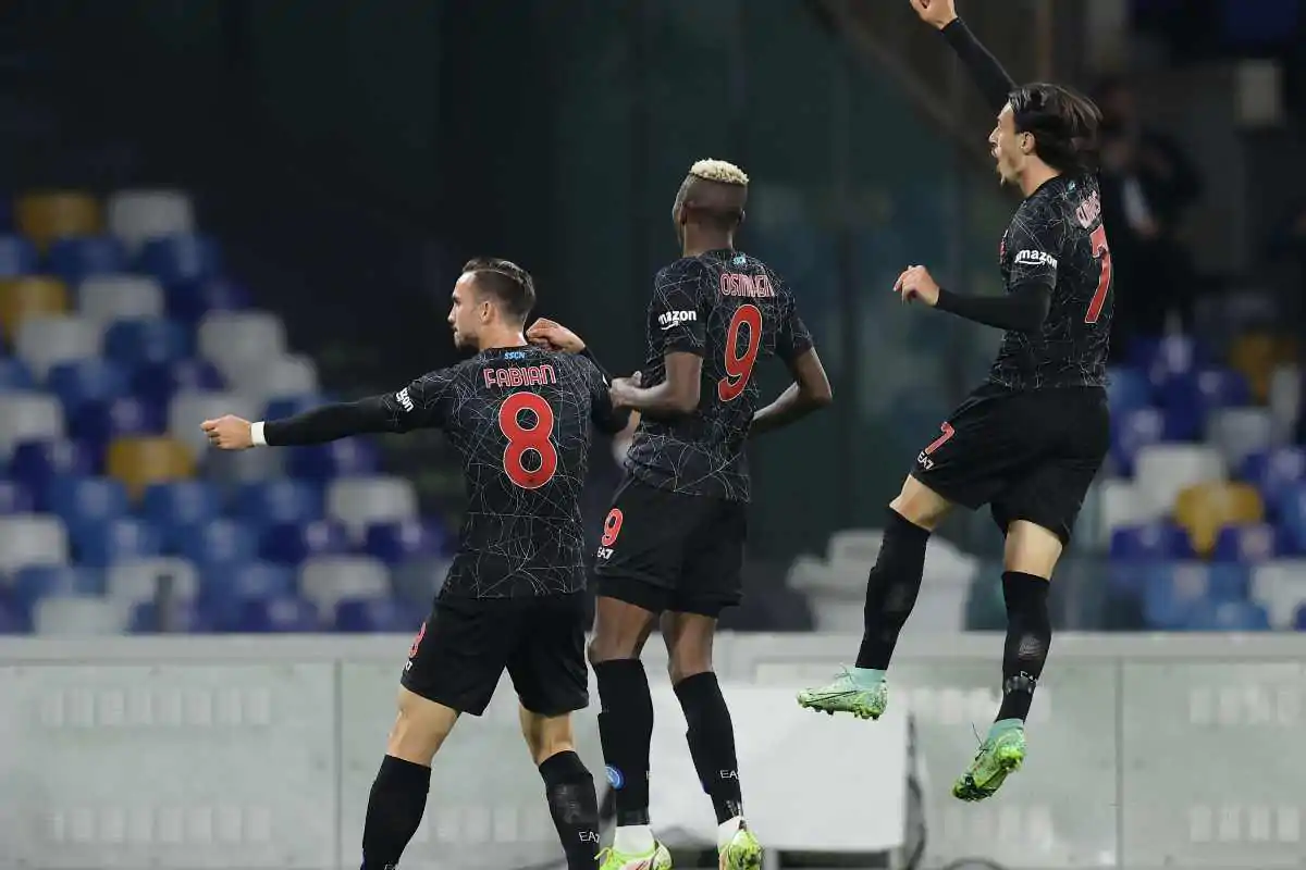 Fabian Ruiz, Osimhen ed Elmas esultano dopo un gol segnato ai tempi del Napoli - Lapresse - SpazioNapoli.it