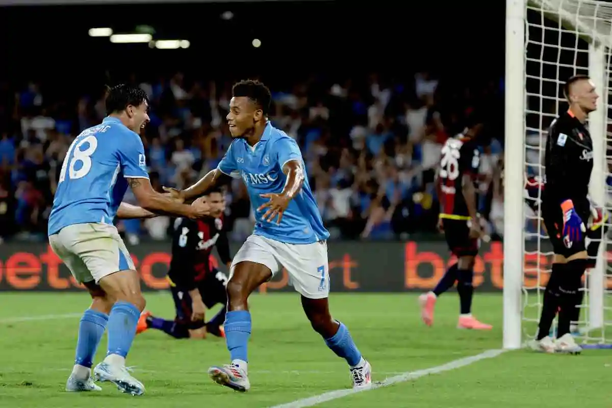 Neres e Simeone esultano dopo il gol in Napoli-Bologna - Lapresse - SpazioNapoli.it