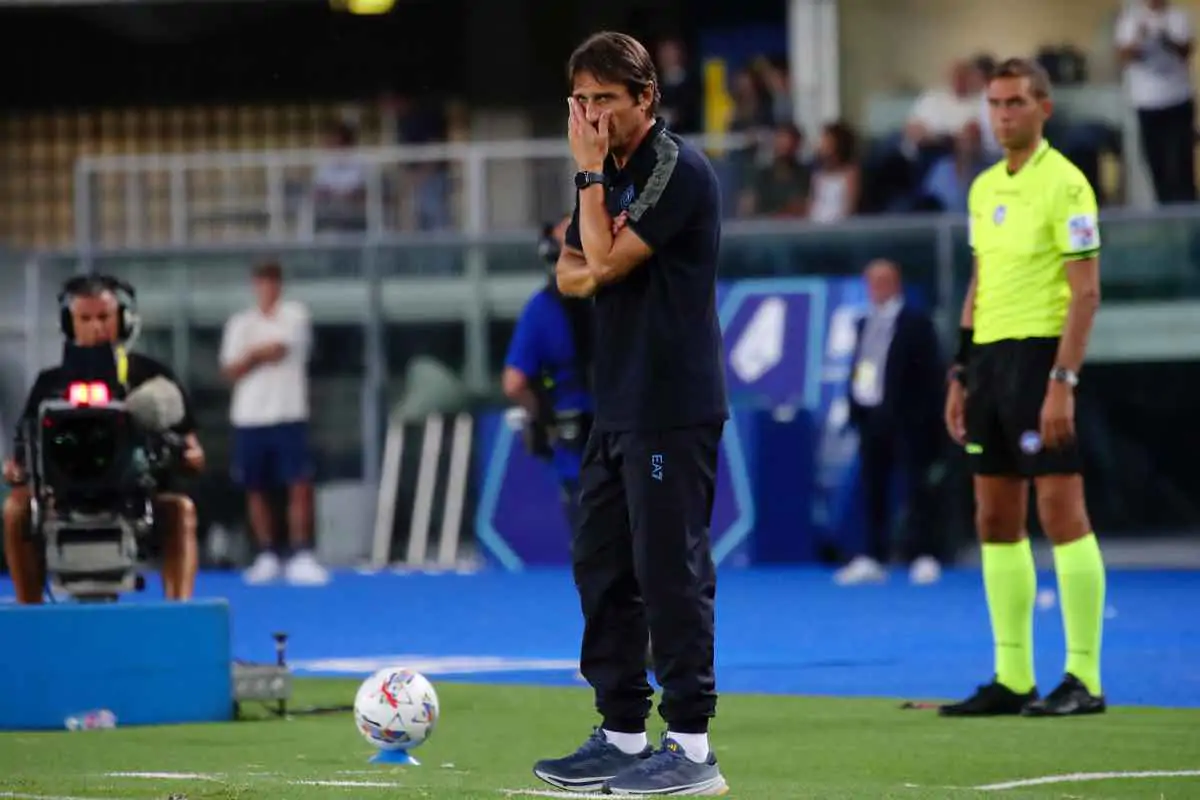 Antonio Conte (head coach SSC Napoli) delusion in the end in action during the Serie A enilive soccer match between Hellas Verona and Napoli at the Marcantonio Bentegodi Stadium, north Est Italy - Sunday, August 18, 2024. Sport - Soccer (Photo by Paola Garbuio /Lapresse)