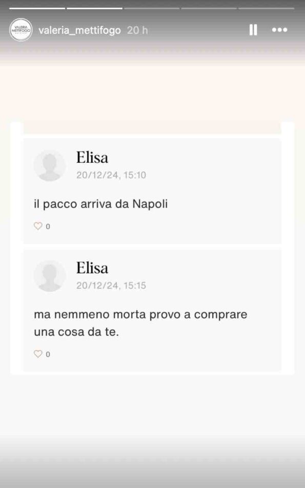 “Ma oggi una signora dopo aver acquistato decide di rimandarmi il pacco con questo commento”, scrive ancora la donna postando, poi, un’immagine dove viene riportato il messaggio di tale Elisa che scrive “Il pacco arriva da Napoli, ma nemmeno morta provo a comprare una cosa da te”.