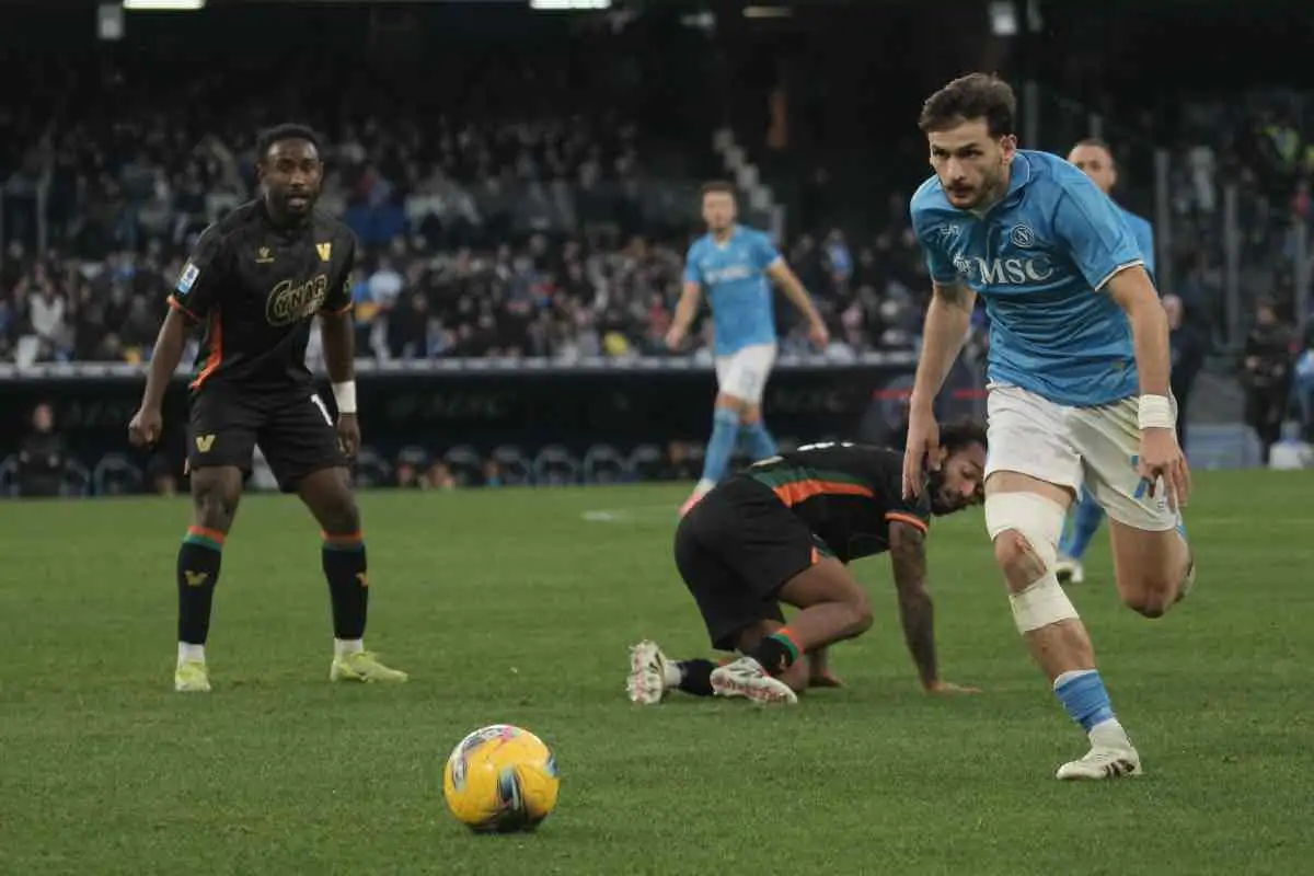 Khvicha Kvaratskhelia in campo con la maglia del Napoli (Ansa Foto) SpazioNapoli.it