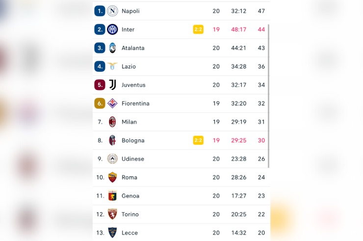La nuova classifica vede sempre il Napoli primo in classifica con 47 punti, mentre l’Inter insegue ora a -3 (in attesa che venga terminato il match contro la Fiorentina e, quindi, con un match in meno disputato). A seguire c’è l’Atalanta, che con il pareggio contro la Juventus ha anch’essa guadagnato un solo punto ai danni della compagine partenopea.