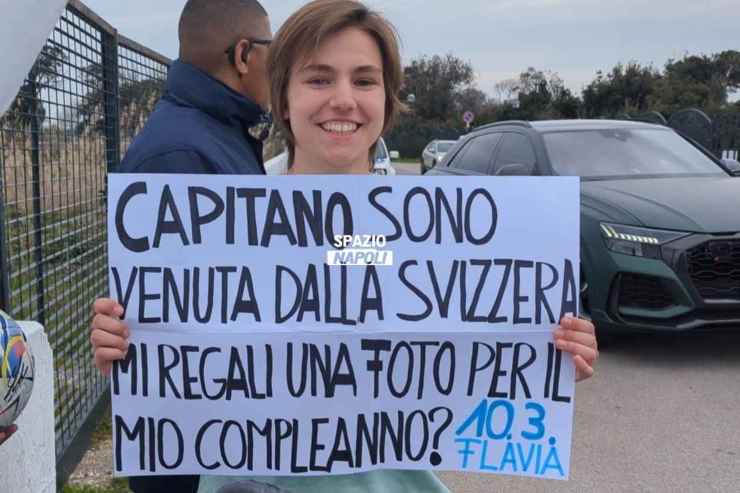 Di Lorenzo si è infatti fermato fuori ai cancelli di Castel Volturno dopo aver visto il cartello di una tifosa per lui che receitava: “Capitano sono venuta dalla Svizzera. Mi regali una foto per il mio compleanno?“. Richiesta che Di Lorenzo non ha esitato nell’accettare, posando insieme alla tifosa col cartello.